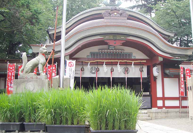 境内には青々とした稲が育ってます。やがて黄金色の穂をたらすかと。この神社は眼病のほか水商売および消防の神様として知られてます。収穫したらお稲荷かな?